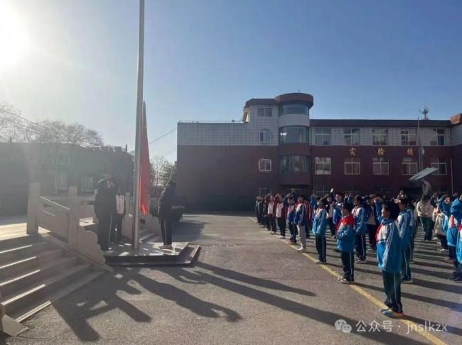 伴随着雄壮的国歌声,五星红旗缓缓升起,全体师生肃立注目,少先队员行队礼。凛冽的寒风中,国旗的鲜红与师生的赤诚相映,每一束目光都饱含对遇难同胞的追思,对和平生活的珍视,对民族精神的敬仰。本次升旗仪式由九年级二班承办,该班级学风浓厚、凝聚力强,曾多次荣获“文明班级”称号,此次以庄重的姿态展现了新时代少年的责任与担当。