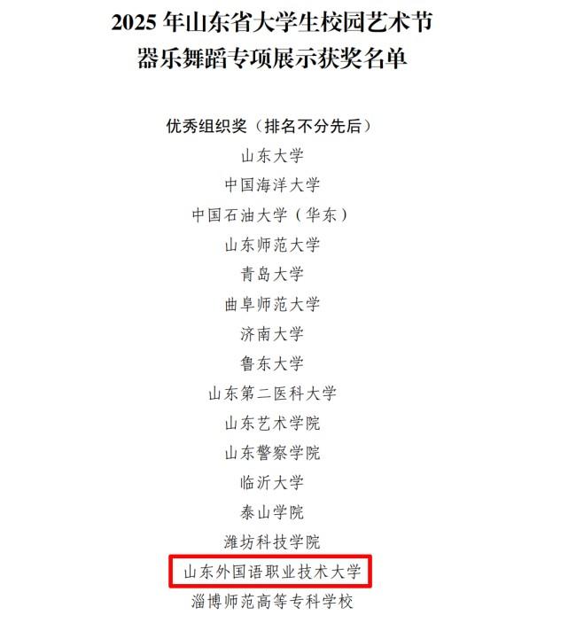 近日,山东省教育厅公布2025年山东省大学生校园艺术节器乐舞蹈专项展示活动获奖情况,山东外国语职业技术大学选送的4部作品全部获奖。其中,《秋日》《淡妆浓抹总相宜》获舞蹈甲组一等奖,器乐作品《天山之歌》获甲组二等奖,《唱支山歌给党听》获甲组三等奖,学校荣获“优秀组织奖”。