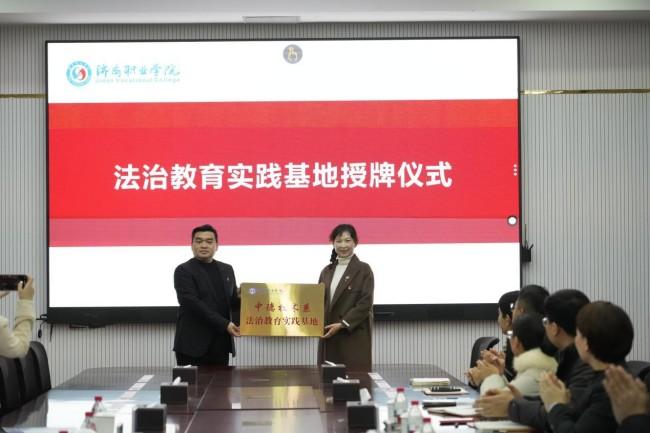 菅娉娉代表学院为山东崇耀律师事务所授予“法治教育实践基地”牌匾,标志着校所共建法治教育平台正式落地,为“中德先锋”党建品牌注入法治新内涵。