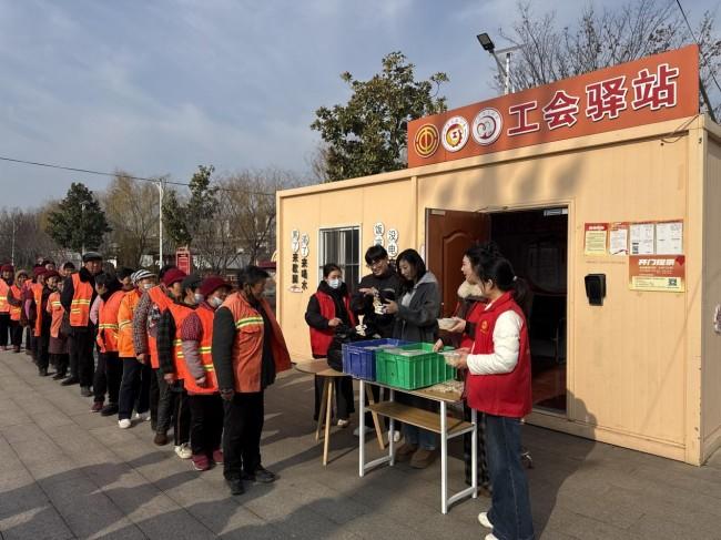 12月18日,济宁市微山县傅村街道总工会联合文化站在程庄工会驿站开展“温情冬至”关爱活动,为环卫工人等户外工作者送上冬日里的暖心关怀。