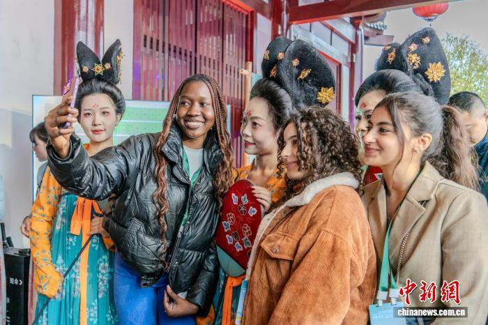 10月17日,河南洛阳,身穿特色服饰的工作人员吸引外宾合影。 记者李超庆摄