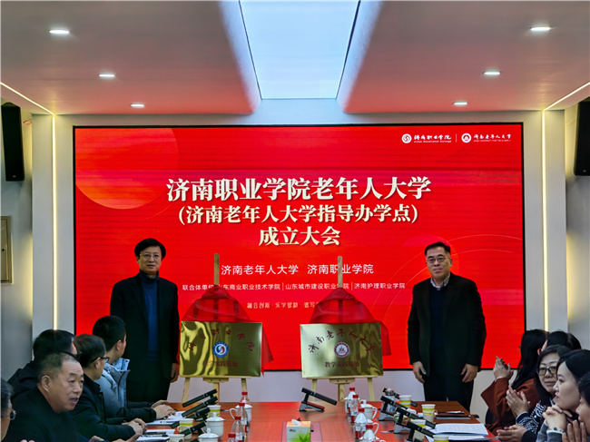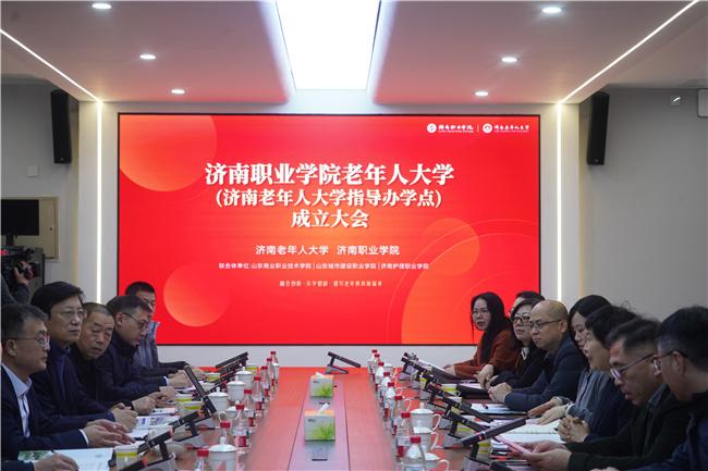 冬日暖阳映校园,银龄逐梦启新程。12月 26日上午,济南职业学院老年人大学(济南老年人大学指导办学点)成立大会在济南职业学院惟实楼四楼会议室举行。市委老干部局副局长、济南老年人大学校长李智,济南职业学院党委副书记、院长尹元华,以及济南老年人大学、历城区老年人大学、历城区彩石街道办事处、山东历城城市发展集团有限公司、山东商业职业学院、山东城市建设职业学院、济南护理职业学院等单位领导参加活动。活动由济南职业学院党委委员、副院长高洪波主持。