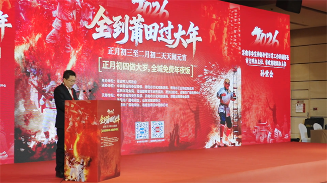 莆田市委常委、宣传部部长陈惠黔在会上作主题推介。陈惠黔从“有一种过年叫莆田”“莆田是一个闹春的城市”“全到莆田过大年”三个角度,生动介绍了莆田春节“一年两度”的历史由来和独特习俗、莆田元宵“一月欢腾”的丰富民俗活动,以及特色美食、自然风光、莆田优品等文旅场景。并向济南及全国游客发出诚挚邀请,2026年正月,全到莆田过大年,体验最火热的元宵民俗,感受最地道的宋韵闽风,来一次全国独一无二的莆田“过年”!