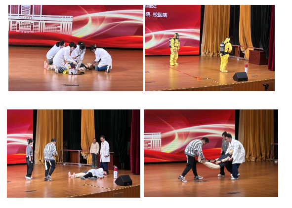 为检验预案实效,理论授课后,活动在报告厅模拟搭建化学与生物工程学院的真实实验室场景,开展氨气泄漏应急演练。师生现场观摩并参与从报警、疏散、自救互救到医疗救护、现场处置的全流程,使应急预案从文本走向实战,提升应对突发事件的协同能力。