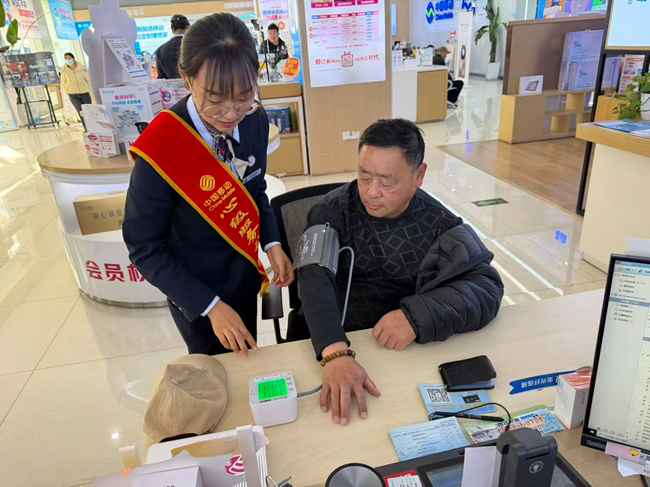 另一侧的健康服务角也备受居民欢迎。工作人员化身“健康助理”,为前来办理业务的客户提供免费血压测量服务,并耐心记录数据,给予日常健康提醒与生活建议。这项贴心举措让客户在办理通信业务的同时,也能享受到一份额外的关怀,真正体现了“服务不止于业务”的理念。