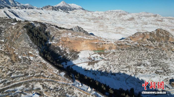 2025年12月22日,航拍下的马蹄寺石窟群银装素裹。戴文昌摄