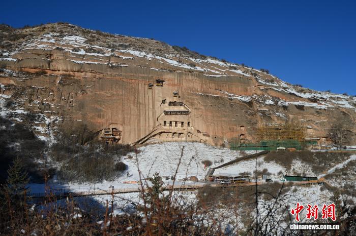 图为崖壁上的千年石窟在白雪映衬下更显古朴沧桑。戴文昌摄