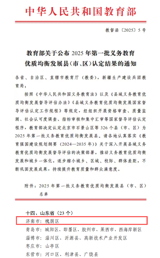日前,教育部公布2025年第一批义务教育优质均衡发展县(市、区)名单,槐荫区作为全市唯一区县成功入选。这是槐荫区继2025年3月摘得“全国学前教育普及普惠县”后,又一次获得“国字号”荣誉。