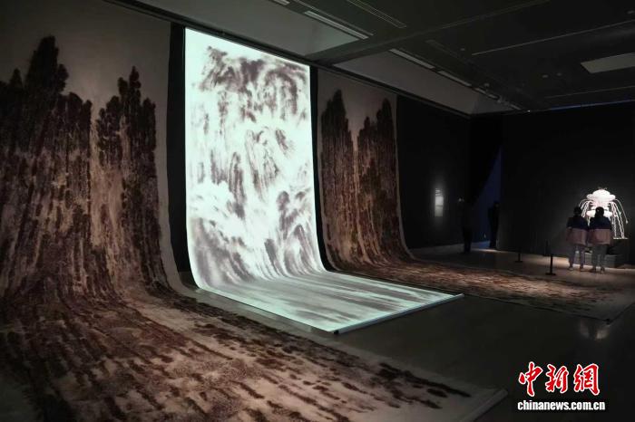 三幅高达10米的画卷从展厅上方倾泻而下,其中一幅有烟云缥缈、流瀑奔腾之感。艺术家赵梓君的影像装置作品《墨山》,借助数字艺术手法,传达古典水墨山水的气韵。丰富的视听渲染效果,令人恍如身临其境。