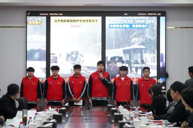 成果汇报环节,山东大学附属儿童医院代表首先发言,介绍了校院合作育人模式。随后,学院“雪中推车”“泰山救人”等学生先进事迹的汇报,生动展现了济职学子见义勇为、乐于奉献的精神风貌。济南市导游协会代表就行业与教育融合实践分享了经验。