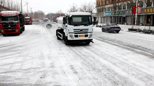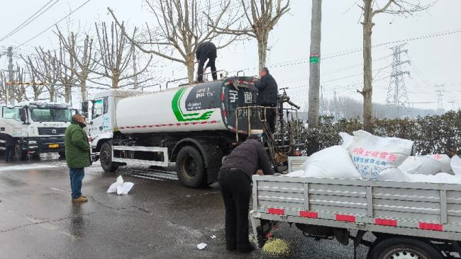 针对气象预警信息,驩城镇统筹协调城建、环卫等部门开展联合作业。作业人员严格按照科学配比,在洒水车中添加环保型融雪剂,确保在实现融雪防冰功能的同时,最大限度减少对道路及环境的影响。