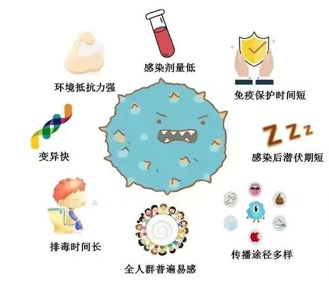 1.超强传播力:仅需十几个病毒粒子就能让人感染发病,感染者一次呕吐可排出数亿计病毒粒子,这些粒子通过气溶胶扩散,极易造成聚集性暴发。