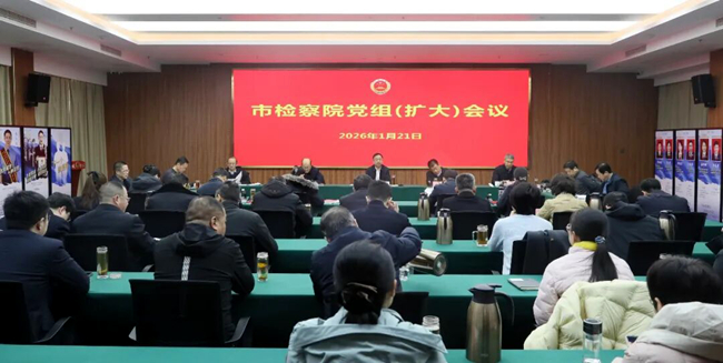 1月21日,聊城市检察院召开党组扩大会,传达学习2026年聊城两会精神,结合全市检察工作实际,研究贯彻落实措施。市检察院党组书记、检察长贾富彬主持会议并讲话,院领导、各部门负责人参加会议并交流学习体会。