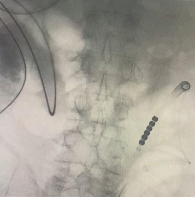 患者在医院急救中心就诊,胃肠外科主任医师王金申、郑春宁评估后,制定了以置入肠梗阻导管并进行药物溶石为主的保守治疗方案。消化内科主任医师李宾及护理团队连夜在胃镜与X线引导下,将导管精准放置至结石近端,引流肠液并注入碳酸氢钠溶液进行溶石。次日,患者入院接受进一步治疗。