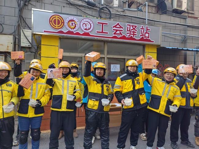 晌午时分,洪家楼西路上的餐饮店迎来短暂休憩。徐志馍肉夹馍、陈氏羊汤、宋老妈排骨等多家餐厅联合推出“错时就餐”暖心服务:下午2点到4点间,为骑手提供免费饮水、手机充电、临时歇脚区,餐饮商家还专门设计出“骑手特惠套餐”——有的一荤一素一汤,米饭管饱,有的根据骑手工作需求定制高饱腹感的特色餐品,餐食种类非常丰富。“他们经常忙到错过饭点,我们能做的不多,但一顿热饭、一杯热水,是可以的,也是应该的。”陈氏羊汤餐馆负责人说。