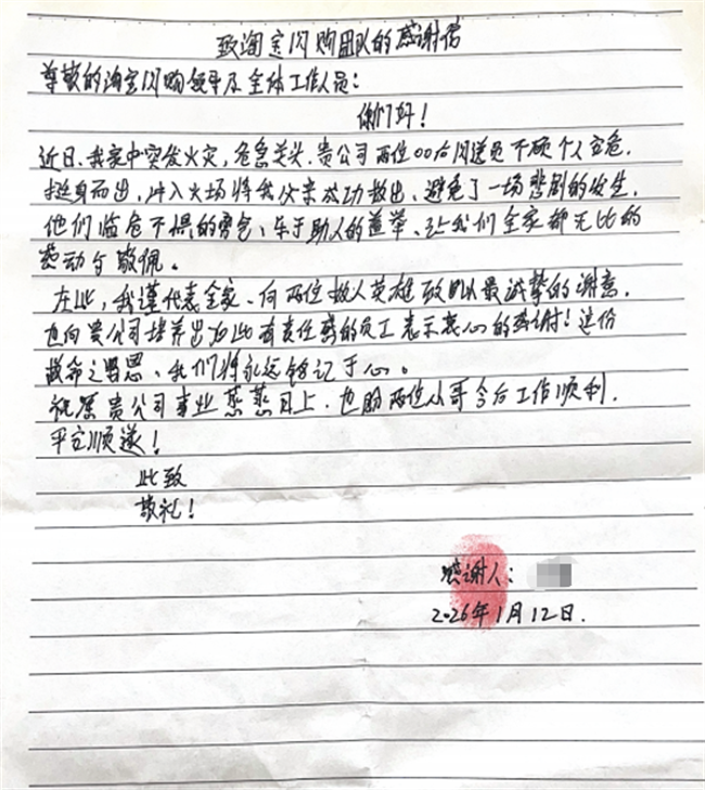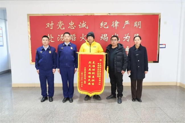 为报答两位小哥的救命之恩,老人的儿子亲笔写下感谢信,还定制了印着“火海救人恩重如山危难相助铭记于心”的锦旗,送到了外卖站点和东港消防救援大队海曲路消防救援站。