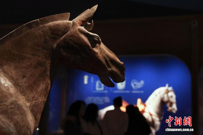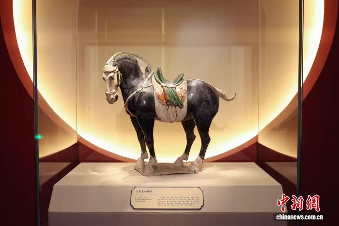 展览现场的“三彩黑釉陶马”。记者王紫儒摄