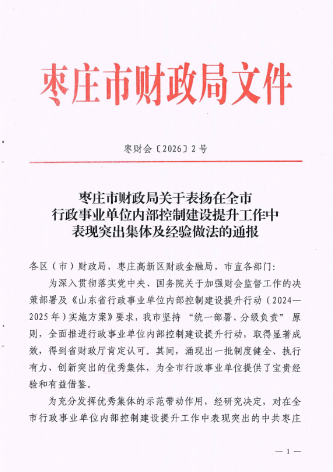 近日,从枣庄市财政局传来喜讯,枣庄职业学院在全市行政事业单位内部控制建设提升工作中表现突出,荣获“全市行政事业单位内部控制建设优秀集体”称号,成为全市内部控制建设工作的先进典型。