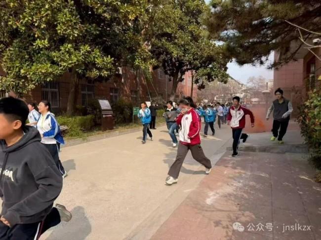 下午14时55分,随着急促尖锐的消防警报声在校园内响起,消防疏散演练正式拉开帷幕。学校现场释放烟雾罐,模拟真实火灾烟雾场景,营造出逼真的应急氛围。同学们在老师的引导下,迅速沿着学校预设的安全疏散路线,快速、有序、安静地从教学楼撤离,全程无拥挤、无推搡、无慌乱。短短一分多钟,全体师生便全部撤离至操场指定安全集合区域,各班班主任第一时间清点班级人数,逐级上报,确认无一人遗漏,整个演练过程紧张有序、高效规范,达到了预期的演练效果。