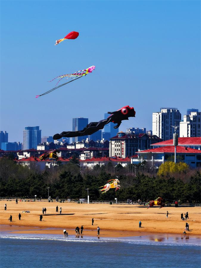 山海天旅游度假区风筝嘉年华震撼登场,百米巨型风筝腾空而起,与碧海蓝天相映成画,尽显非遗风筝磅礴气势。李磊/摄