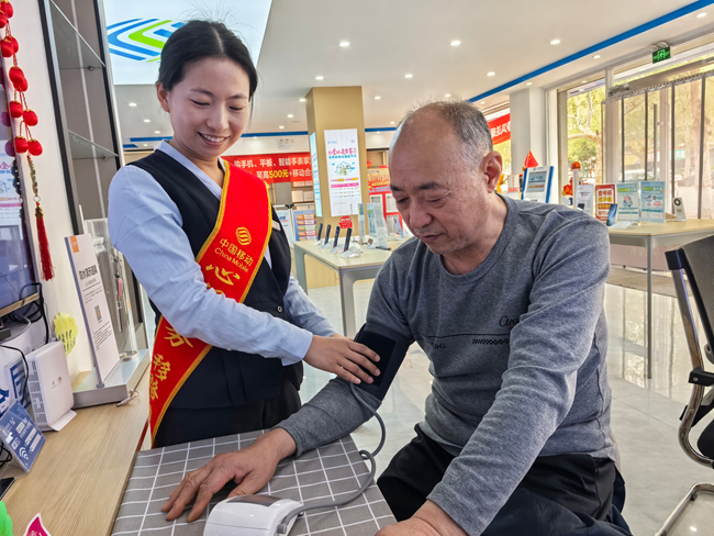 在山东移动莘县分公司营业厅里,一抹温暖的身影格外动人:工作人员身着“心级服务”绶带,正细心为老年客户测量血压,耐心询问身体状况,用专业与温情守护银发群体的健康与安心。这一幕,正是移动人践行爱老助老承诺、打造适老暖心服务的生动写照。