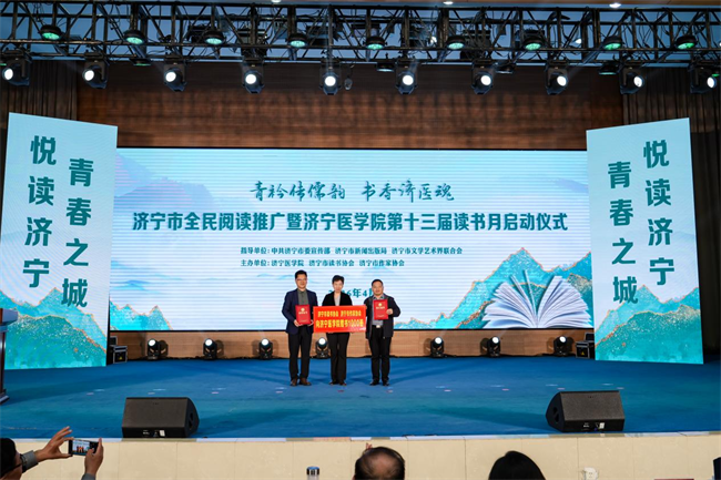仪式现场,郭玉宣读《全民阅读倡议书》,济宁医学院学生代表崔蓓蓓发出青春倡议。与会领导为济宁市全民阅读优秀推广人、济宁医学院2025年度阅读之星颁奖;济宁市作家协会、济宁市读书协会向学校赠书1000余册,王超与学校领导共同展示“青衿传儒韵・书香济医魂”书法长卷。在全场倒计时中,与会领导嘉宾共同按动启动柱,宣布活动正式启动。