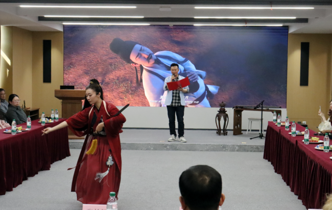 活动伊始,一曲古琴演奏《沧海一声笑》配合着少年书生素衣剑舞,拉开了此次活动的序幕。来自山东工艺美术学院人文学院的彭鹏教授对中国古剑发展历程进行了详细讲解:从原始社会剑的萌芽期,到青铜兵器时代商周青铜短剑雏形及中外闻名的春秋战国越王勾践剑、吴越复合剑,再到唐宋、明清等历代古剑的发展与演变,还有备受文人雅士喜爱的文房用剑……彭教授的讲解妙趣横生、引人入胜。团队还向现场观众近距离展示了1:1复刻的历代古剑仿制品,让在场中外人士了解了古剑形制、材质与功能的演变,直观感受古剑的精湛与独特。