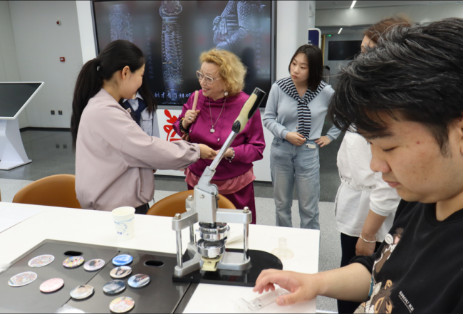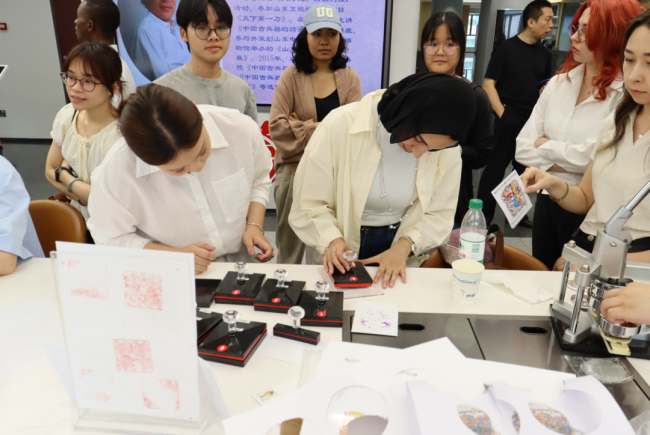 活动下半场,古剑修复工作室在工艺体验区,为现场中外嘉宾准备了互动体验。大家对古剑纹饰雕刻产生了浓厚兴趣,工作室的修复人员详细讲解了古剑纹饰的象征与意义;在手工体验区,中外嘉宾体验了古剑甲片錾刻、纹饰拓印、剑柄缠绳等传统技艺,试穿了古代铠甲和汉服拍照留念。现场气氛热烈,欢声笑语不断,来自济南职业学院的外籍志愿者担任现场翻译。