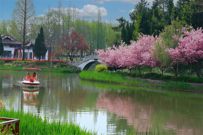 春湖漾着粉樱倒影,小船载着暖意轻划。宋金勇/摄