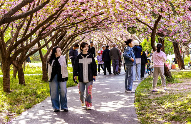公园内粉樱枝桠交叠成浪漫花廊,步道上游人或缓步赏春,或举机定格盛景。厉新昌/摄
