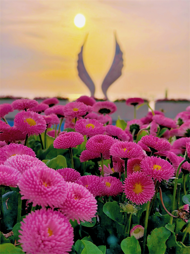 粉紫雏菊裹着落日金辉,在海边簇簇盛放。徐睿/摄