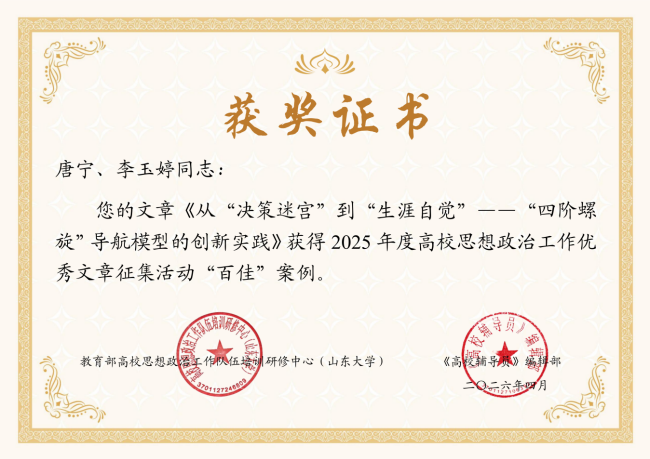 近日,教育部高校思想政治工作队伍培训研修中心公布2025年度高校思想政治工作优秀文章征集活动评选结果。枣庄职业学院辅导员唐宁、李玉婷撰写的《从“决策迷宫”到“生涯自觉”——“四阶螺旋”导航模型的创新实践》获评全国“百佳”案例,彰显了学院在思政育人与辅导员队伍专业化建设上的扎实成效。