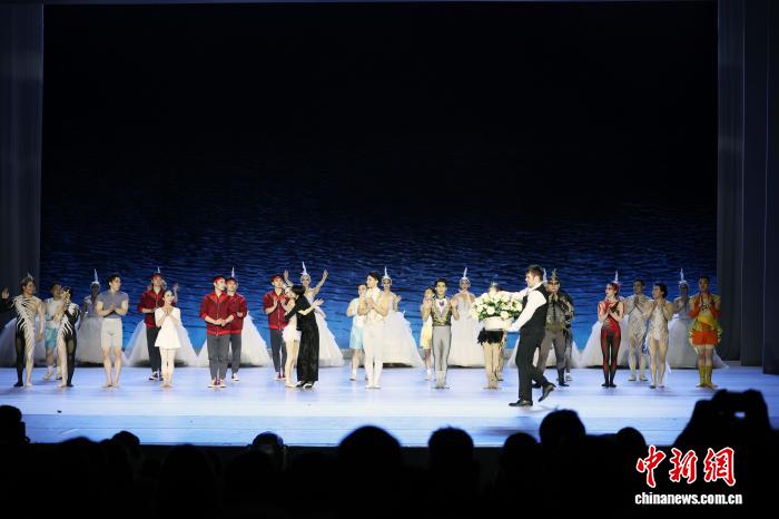 当地时间4月24日,中国广州市杂技艺术剧院创作演出的杂技剧《天鹅》在俄罗斯莫斯科大剧院演出。图为演职人员谢幕。中新社记者田冰摄