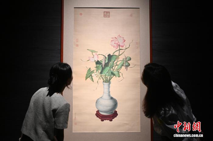 4月27日,香港苏富比拍卖行举办2026年亚洲艺术周拍卖传媒预览活动。图为两名女士观看清宫画家郎世宁所绘《池莲双瑞》。中新网记者李志华摄